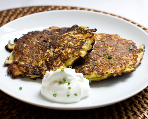 For thousands of years zucchini has been eaten in Central and South American countries but has only been a widely consumed vegetable in North America for about 30 years. The variety that is grown here is a green Italian squash. There are many types of zucchini grown these days but the most common is still the summer green zucchini. It can grown up to a meter long but is best picked around 8 inches (20 cm) while the seeds are still soft and small. In honor of this prolific vegetable, here is a recipe for zucchini pancakes that does this mild vegetable justice.